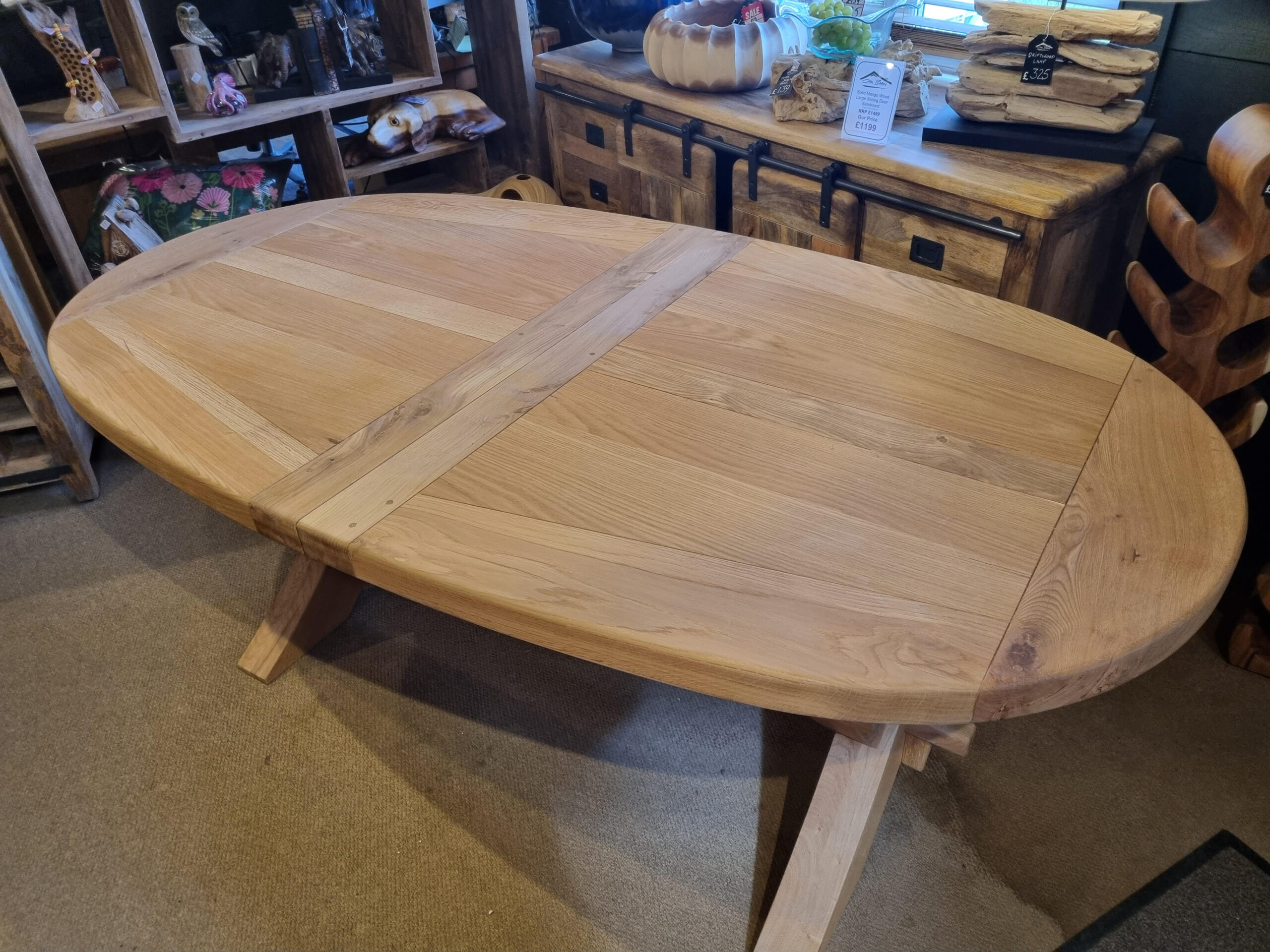 A beautiful large French oak oval extending table with 2 leaves.