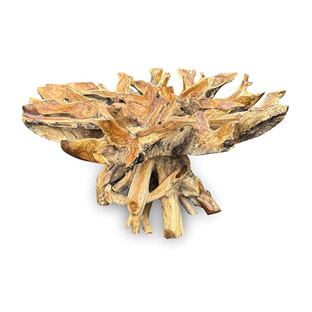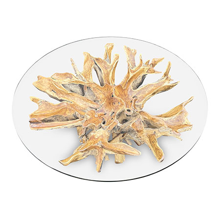 A large Lombok Teak root dining table with a 180cm round glass top.
