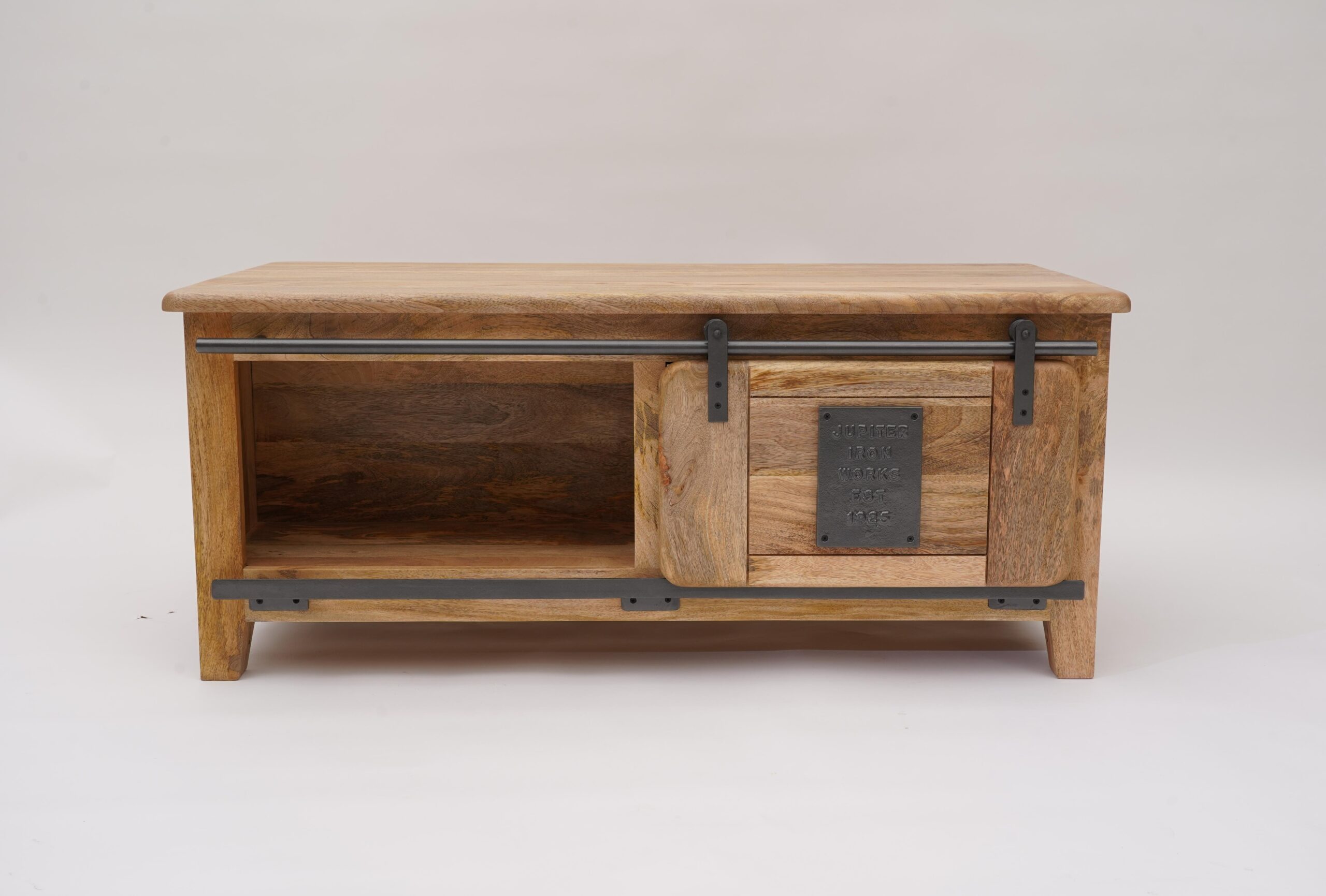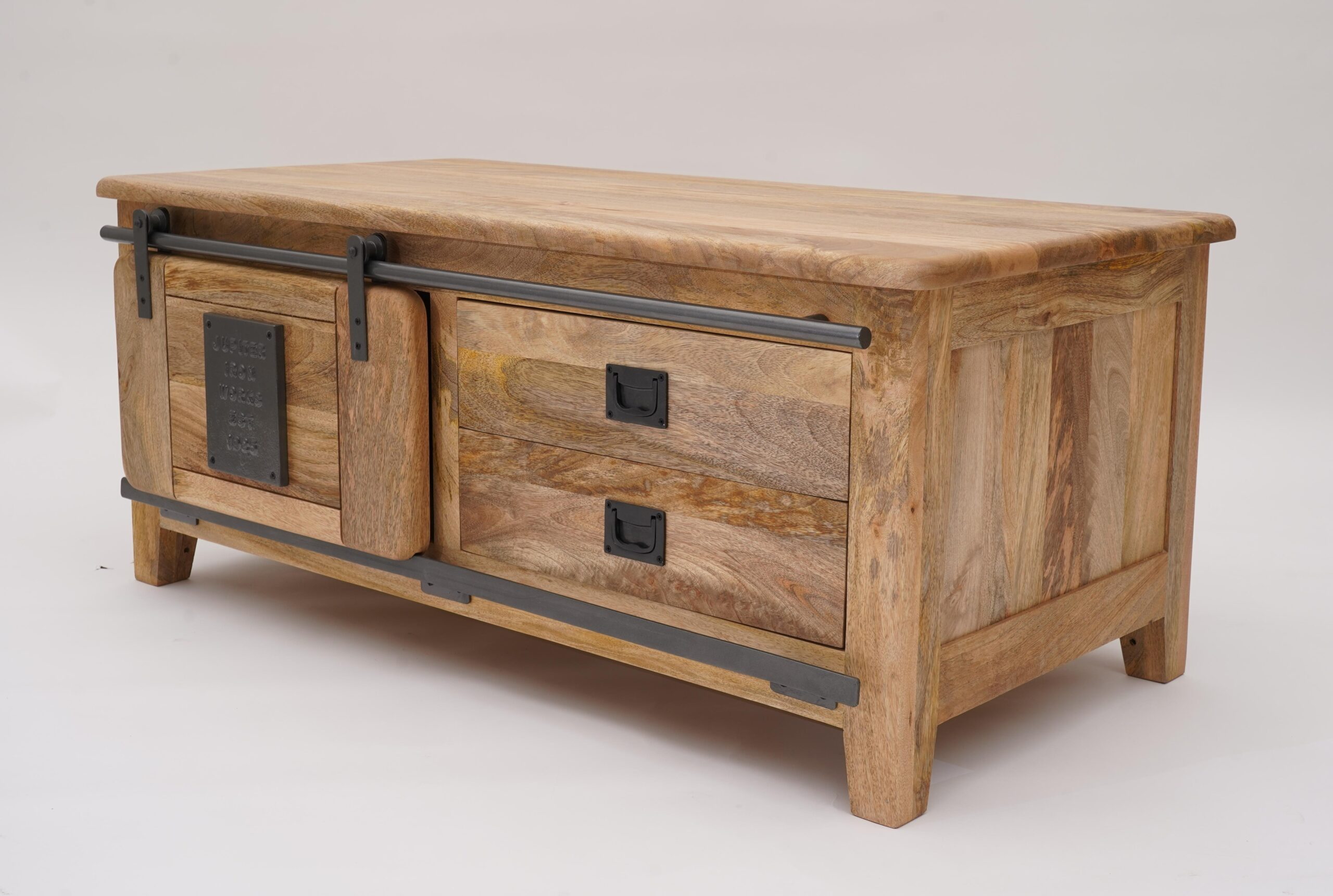 Made from solid mango wood, with black iron runners and handles, this charming coffee table will take centre stage of your living area.